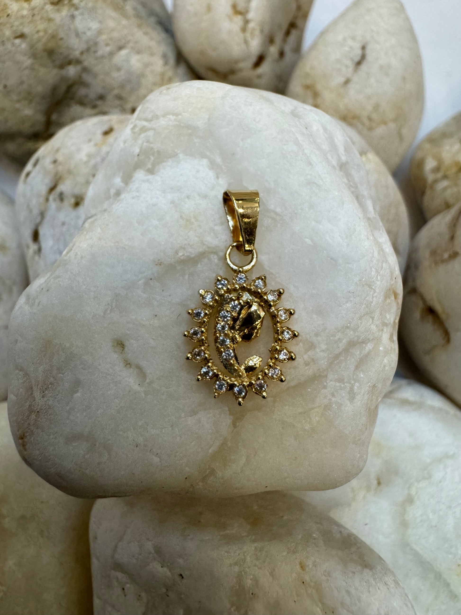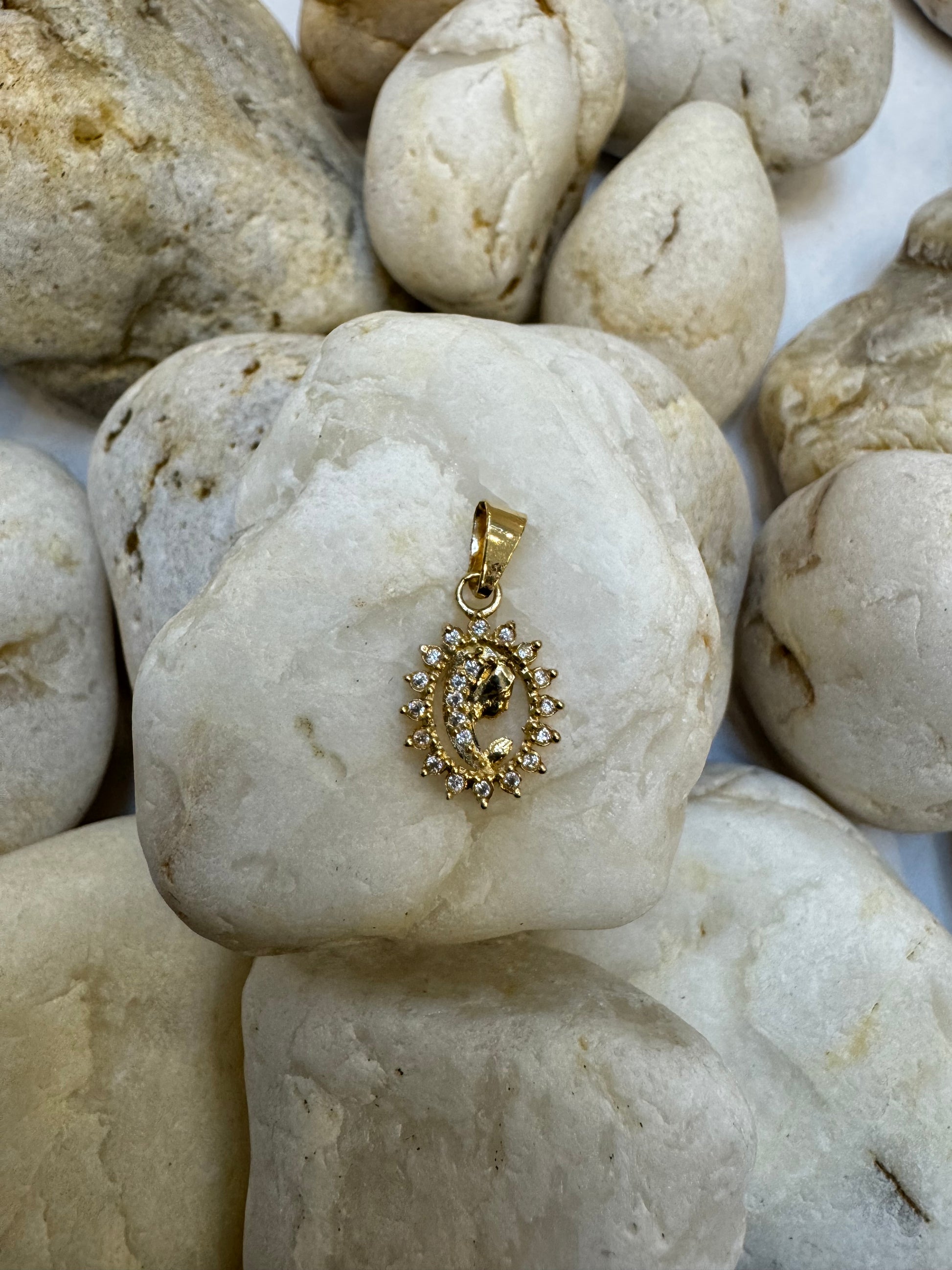 Ave María es un dije con la silueta de la virgen María rezando, ideal para obsequiar en una comunión o bautizo. Representa la devoción y fe. Elaborado con oro 18 quilates y circones al rededor.