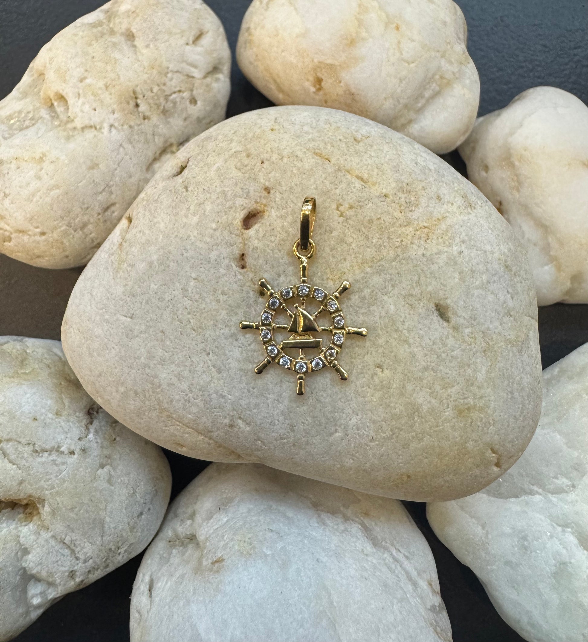 Expresa tu amor por el mar con nuestro dije timón elaborado en oro 18 quilates, adornado con un pequeño barco y circones. El accesorio perfecto para destacar tu pasión por la vida marina y añadir un toque de elegancia y aventura a tu look.