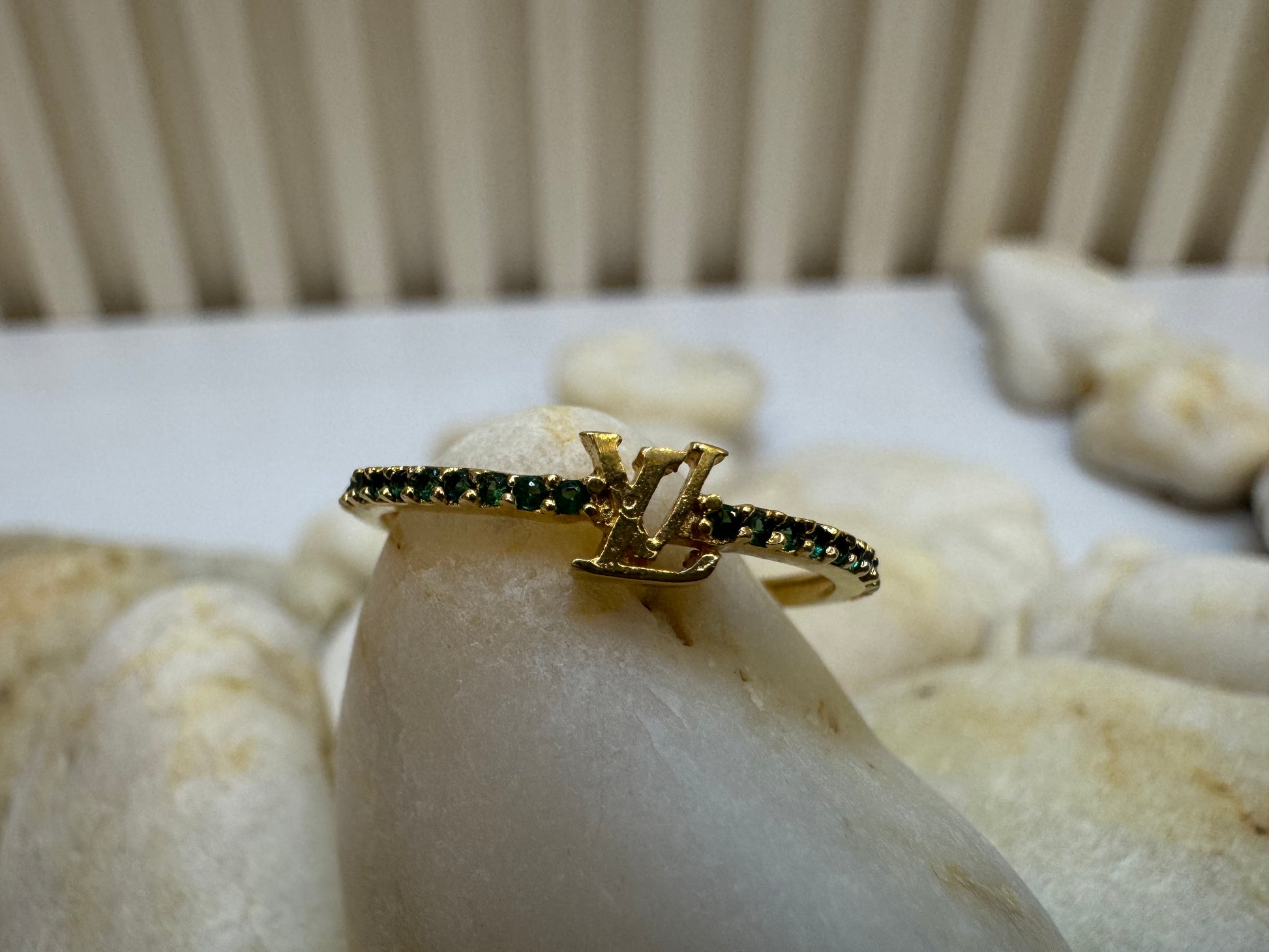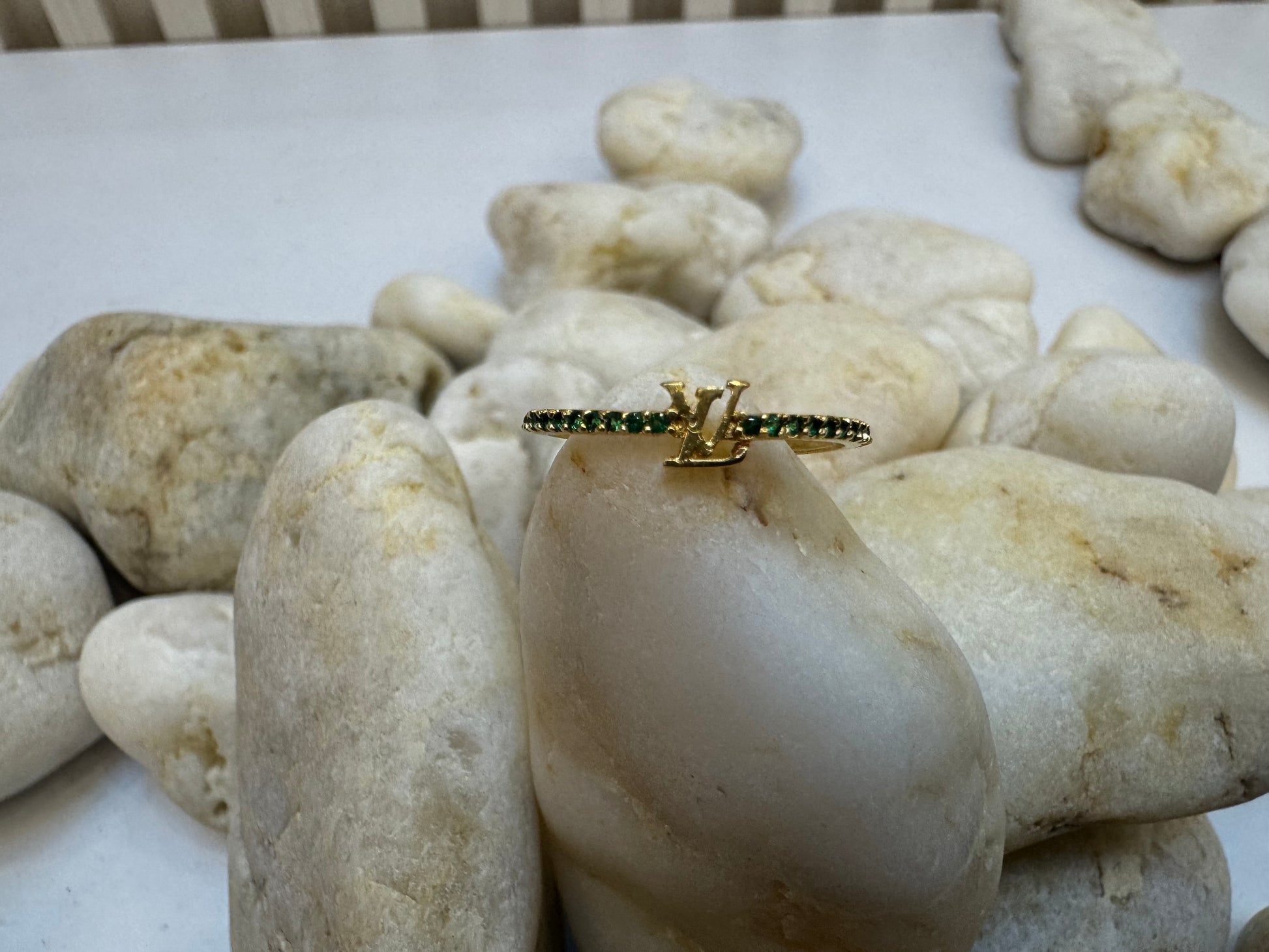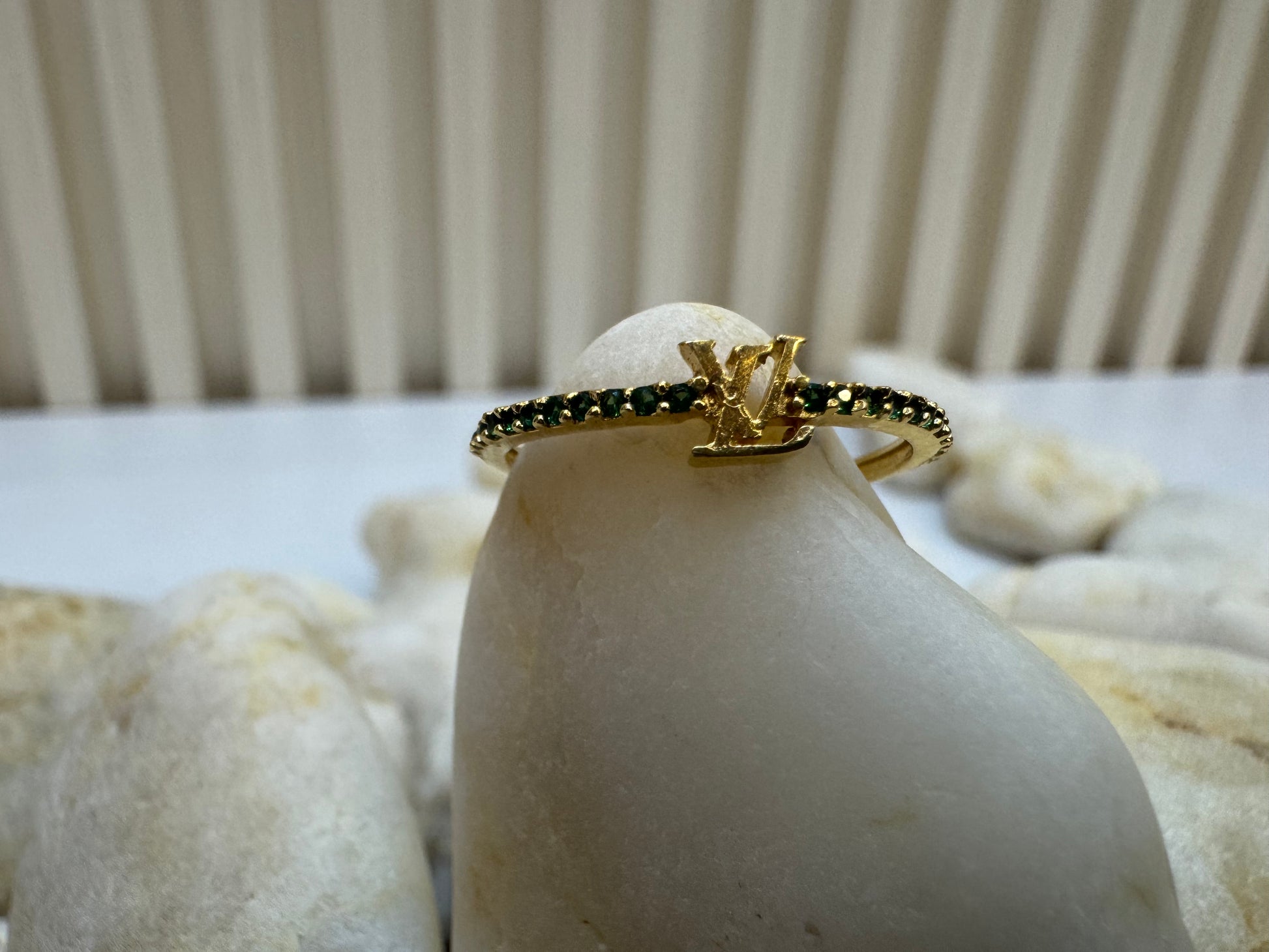 Este hermoso anillo Louis Vuitton está elaborado en oro de 18 quilates y cuenta con preciosas piedras verdes. Con un alto nivel de calidad y sofisticación, este anillo es una verdadera joya para complementar cualquier atuendo con un toque de elegancia y estilo.